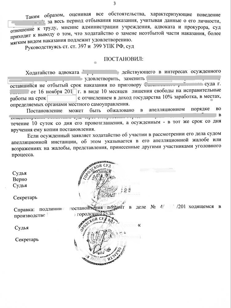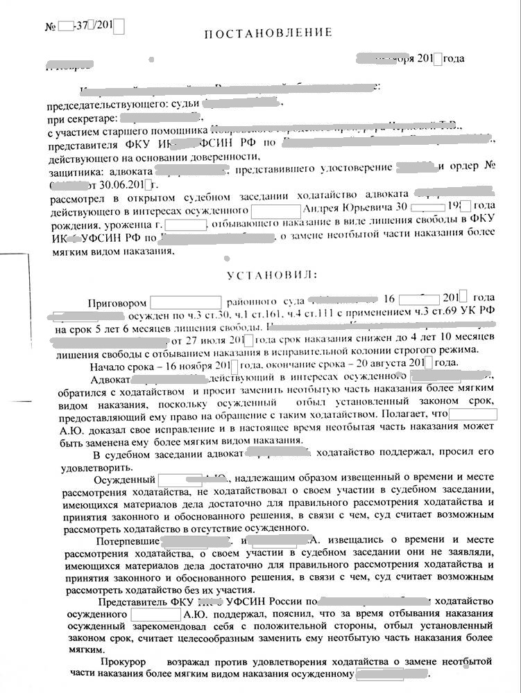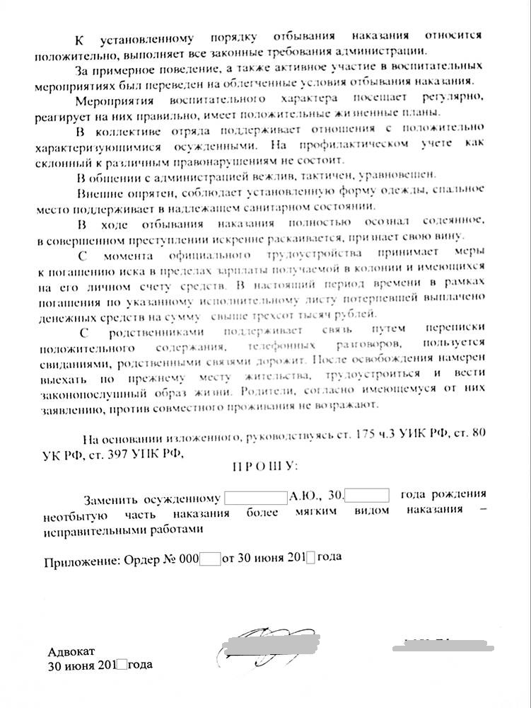 После подготовки адвокатом всех документов менее через два месяца мне удалось убедить суд и заменить неотбытую часть наказание более мягким видом наказания -  исправительными работами.